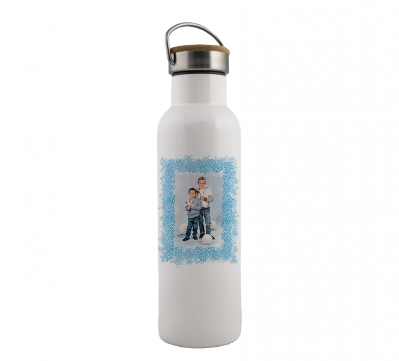 Designová termoska se šroubovacím uzávěrem a bambusovým vičkem.
