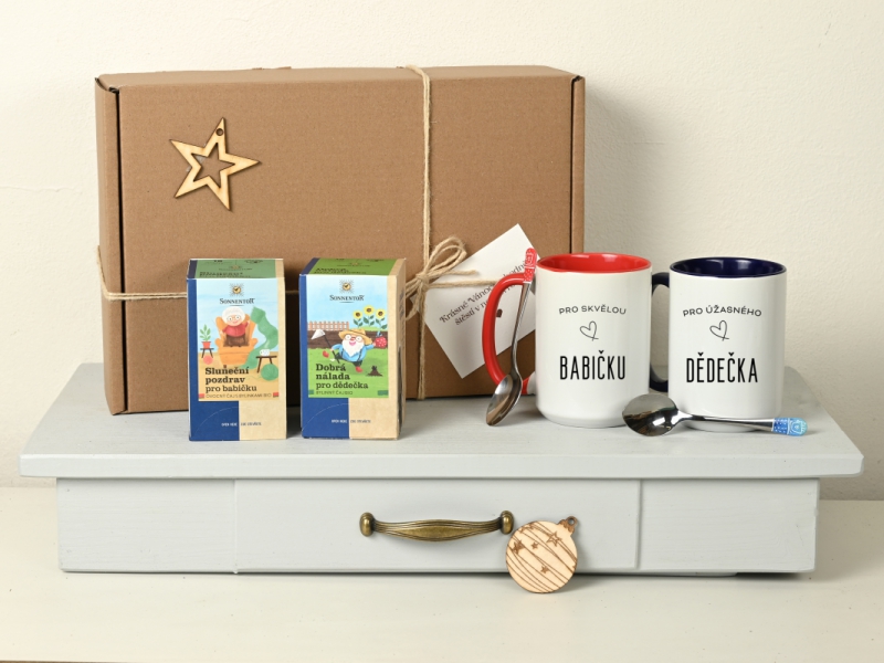Babička a dědeček najdou v balíčku krásné hrníčky s fotografií jejich vnoučete, která jim bude připomínat nejen krásné chvíle strávené spolu, ale také to, jak důležitou roli hrají v životě své rodiny.