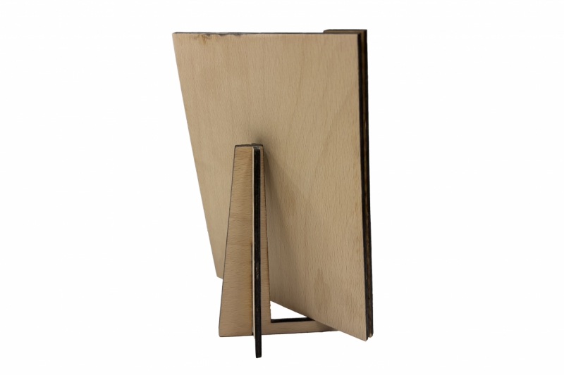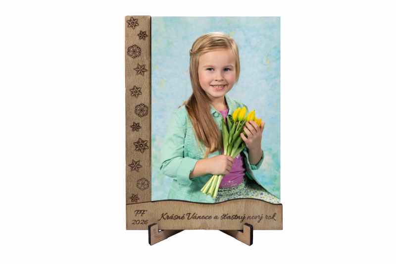 Dřevěné přání se stojánkem a fotografií.