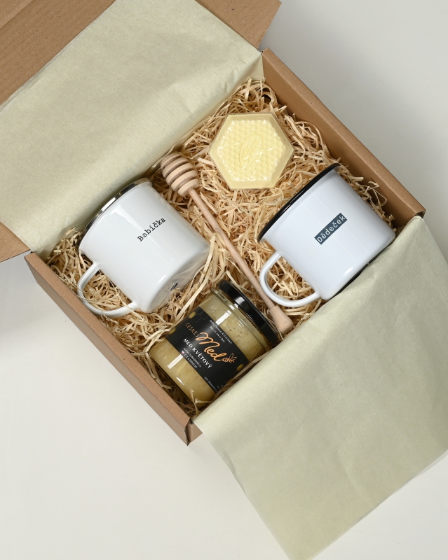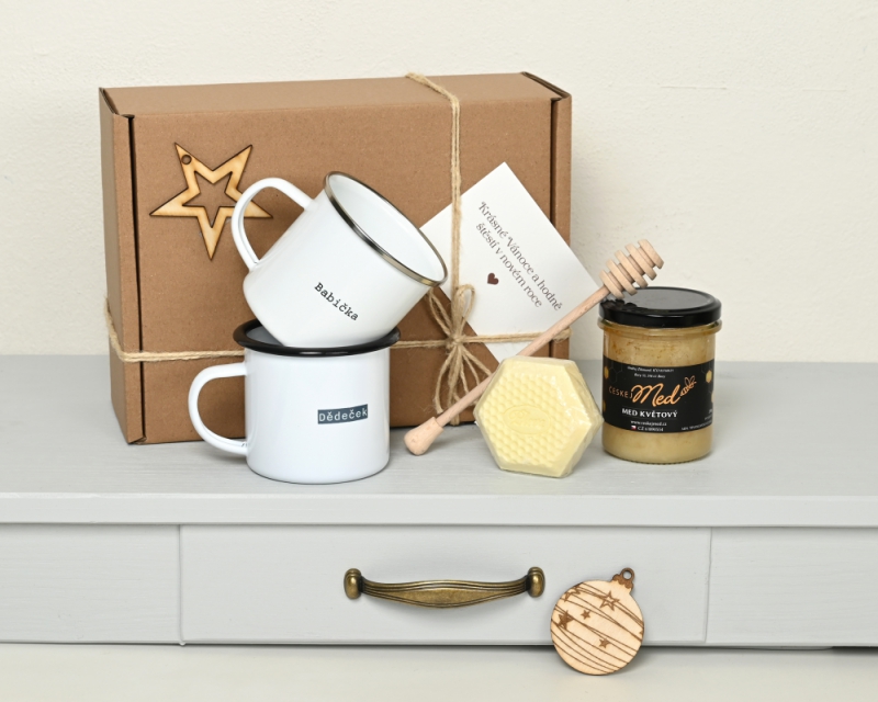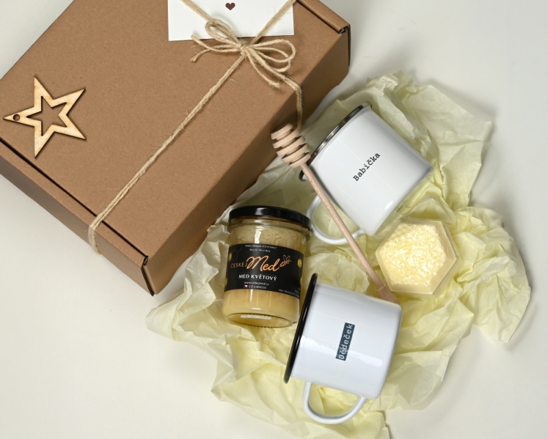 Vše je pečlivě zabaleno v dárkové krabičce s dřevěnou dekorací.