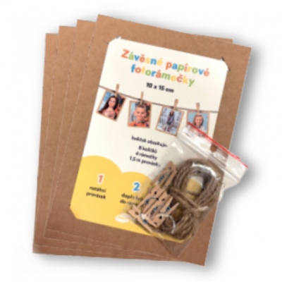 Rámeček kartonový s výsekem 4 ksProvázek 150 cm (+/- 5 cm)Kolíčky dřevěné 8 ks